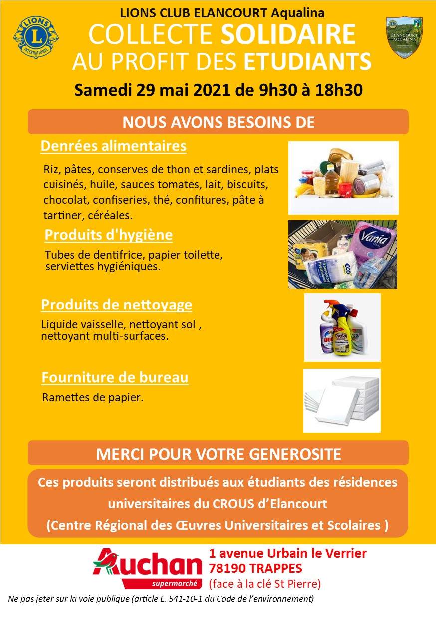 Le LIONS CLUB ELANCOURT Aqualina organise le samedi 29 mai 2021 de 9H30 à 18h30 au supermarché AUCHAN, 1 avenue Urbain le Verrier à TRAPPES, une collecte solidaire au profit des étudiants.