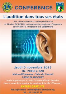 A l’occasion de la semaine du handicap organisée par la ville d’Elancourt, le LIONS CLUB ELANCOURT Aqualina organise une conférence « Laudition dans tous ses états » le jeudi 6 novembre 2025 à 19H30 dans la salle du conseil de la Mairie d’Elancourt.
