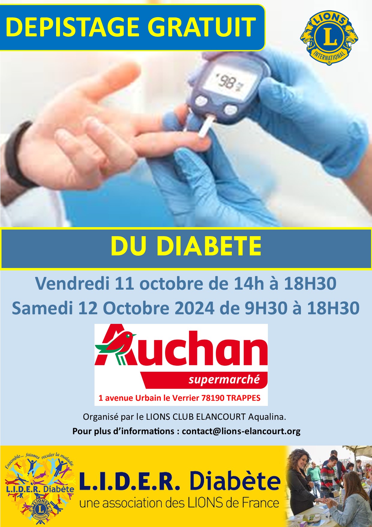 Comme chaque année, le LIONS CLUB ELANCOURT Aqualina organise le dépistage GRATUIT du diabète au Supermarché AUCHAN 1 avenue Urbain Le Verrier à Trappes en face de La Clé Saint Pierre.